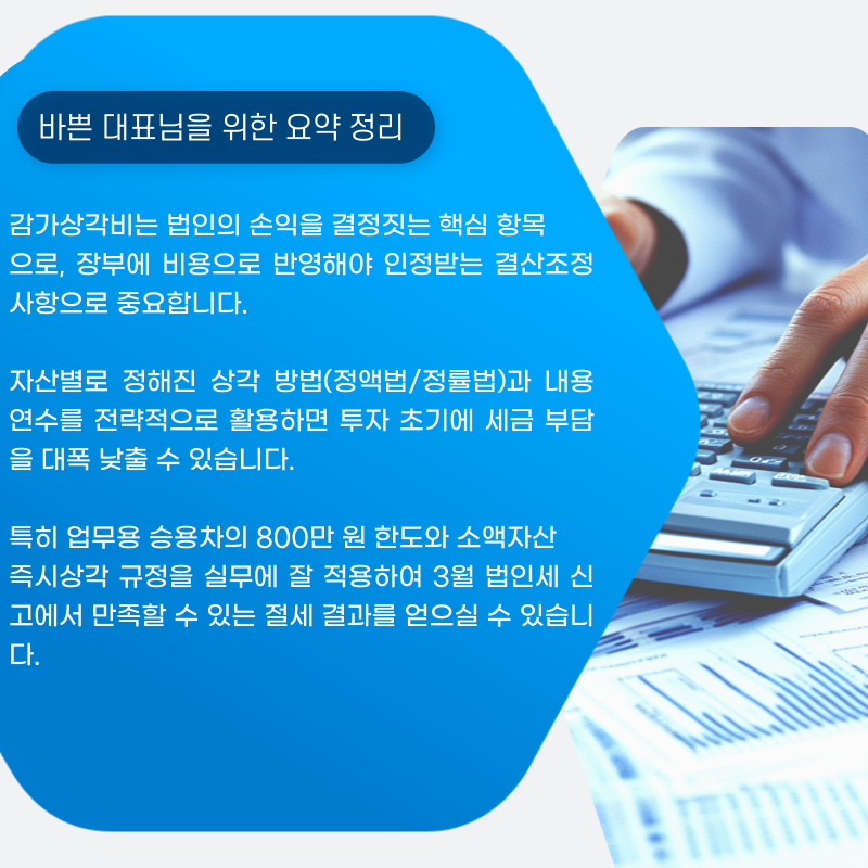 투자 자산의 감가상각비는 법인세 절감의 중요한만큼, 항상 최신 법규와 회계기준을 숙지하시기 바라며, 미리 세무사의 조력을 받는 것도 좋은 방법입니다!