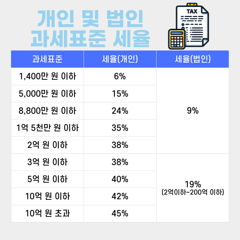 일정 소득 이상에서는 개인사업자의 소득세율(최고 45%)보다 법인세율(최고 24%)이 상대적으로 낮아 세금 부담을 줄일 수 있습니다.