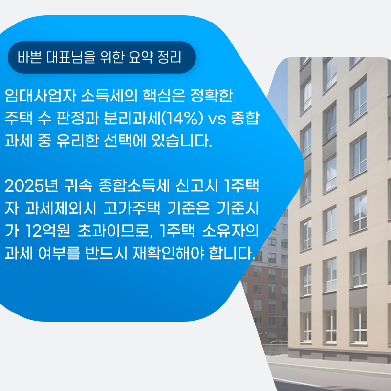임대사업자 종합소득세 신고의 핵심은 정확한 주택 수 판정과 증빙 중심의 경비 관리에 있습니다.