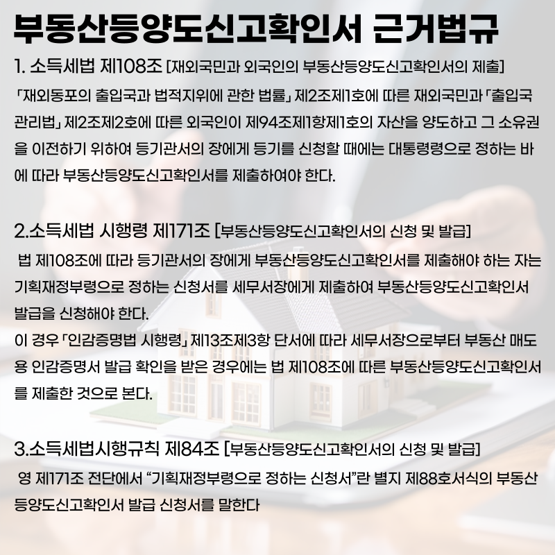 발급 시점: 국내에 소유한 부동산을 양도하고 소유권 이전 등기를 신청하기 전에 반드시 세무서로부터 발급받아야 합니다. 이에 재외국민등이 양도한 국내 부동산의 잔금을 수령하고 매수인이 소유권 이전등기를 할 때 이 확인서가 제출되어야 합니다.