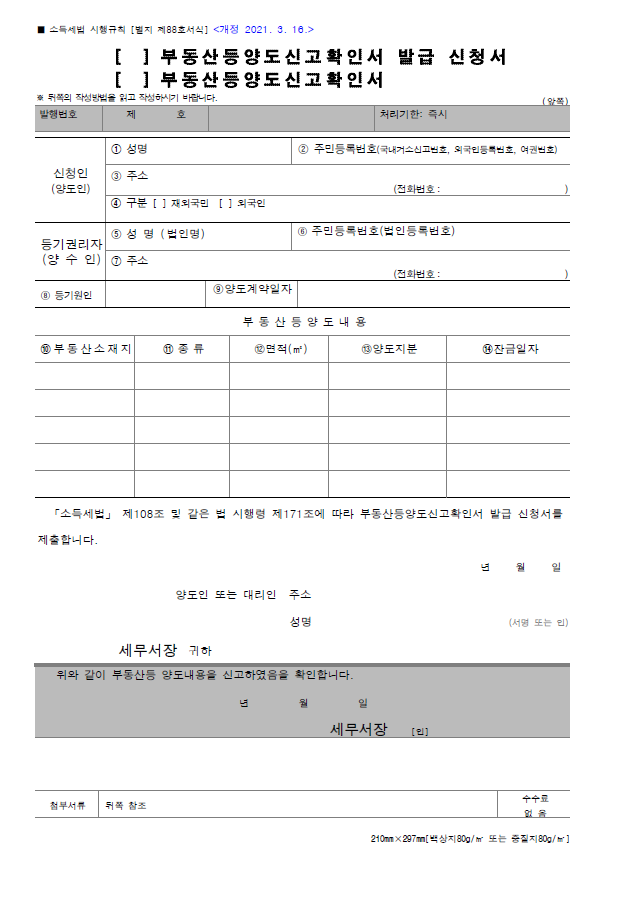 2. 확인서 신청:세무서에 ‘부동산 등 양도신고 확인서 발급 신청서’를 제출합니다. 이때 매매계약서, 등기부등본, 납세 증명 서류 등이 필요할 수 있으니 미리 준비해야 합니다.