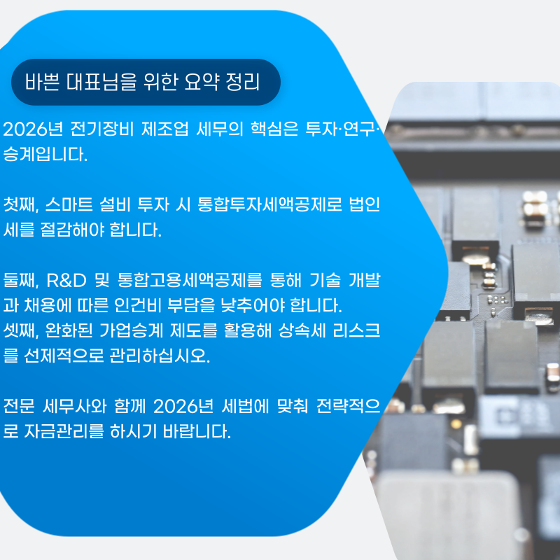 지금까지 전기장비 제조업에 특화된 세무 전략과 함께, 25~26년 세법 개정의 핵심 내용을 자세히 알려드렸습니다.