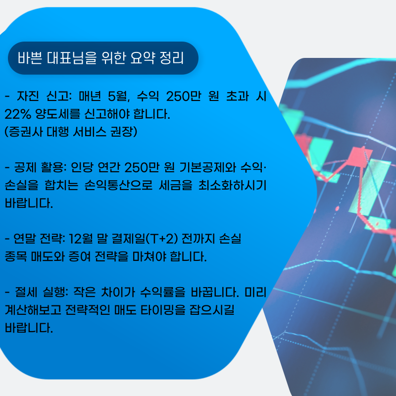 ◎ 손익통산: 1년 동안 발생한 모든 해외주식의 손실과 이익을 합칩니다. 예를 들어, A주식에서 1,000만 원 수익을 냈지만 B주식에서 800만 원 손실을 봤다면, 최종 200만 원에 대해서만 양도차익으로 봅니다. 이 경우 기본공제 250만 원보다 적으므로 세금은 0원이 됩니다.