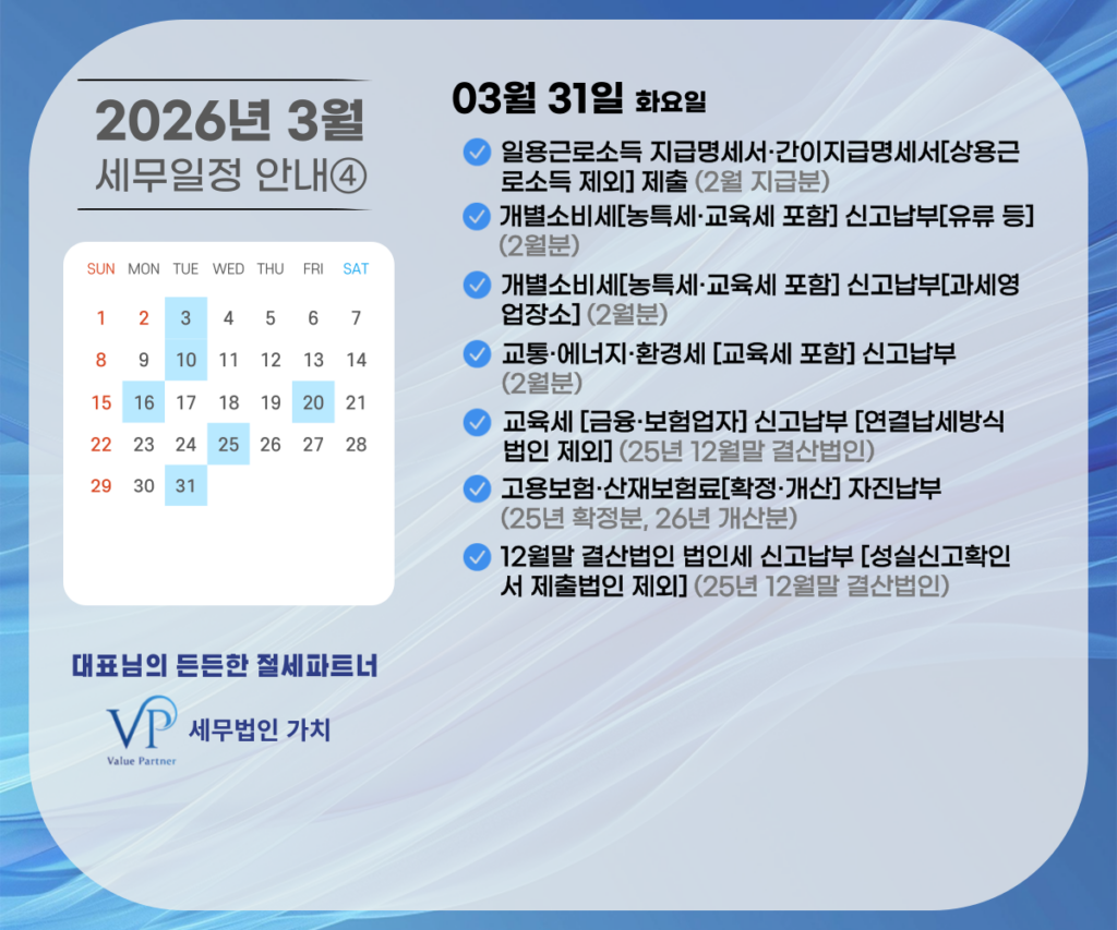오늘은 2026년 3월 세무 일정을 알려드리려고 합니다.