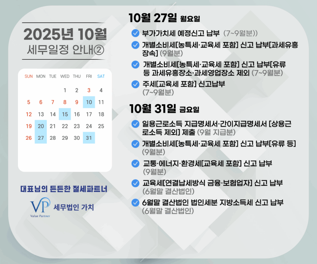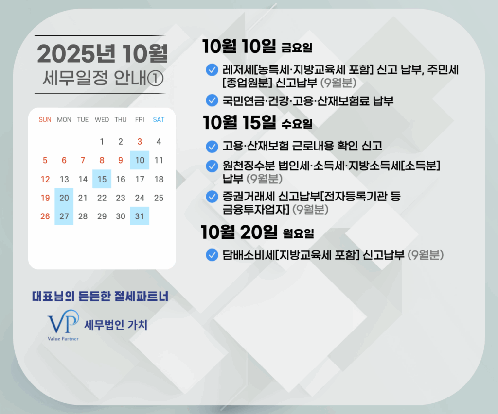 오늘은 2025년 10월 세무 일정을 알려드리려고 합니다.
