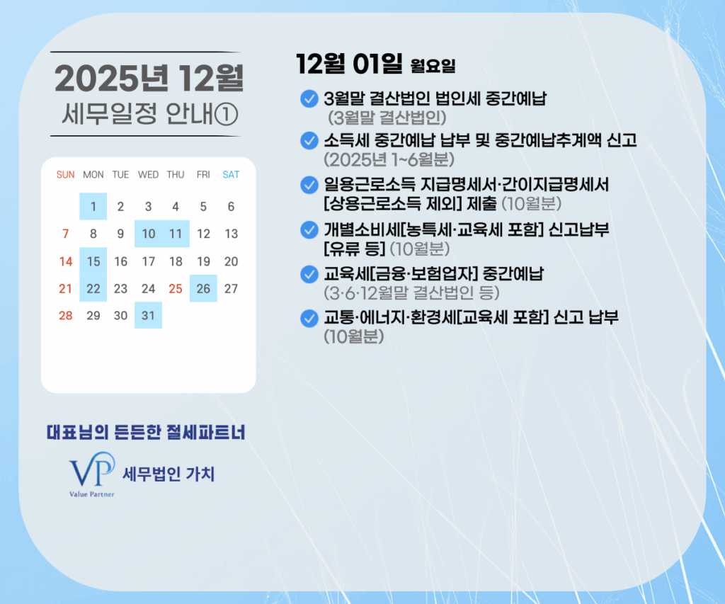 오늘은 2025년 12월 세무 일정을 알려드리려고 합니다.