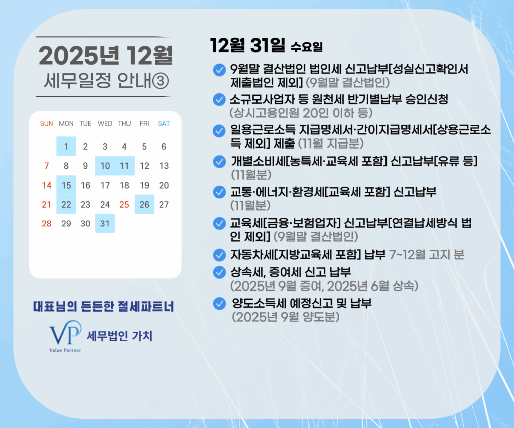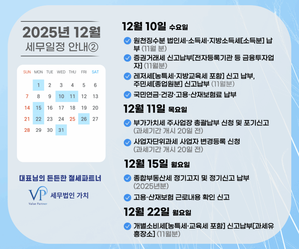 지금까지 25년 12월 세무일정을 알려드렸습니다.