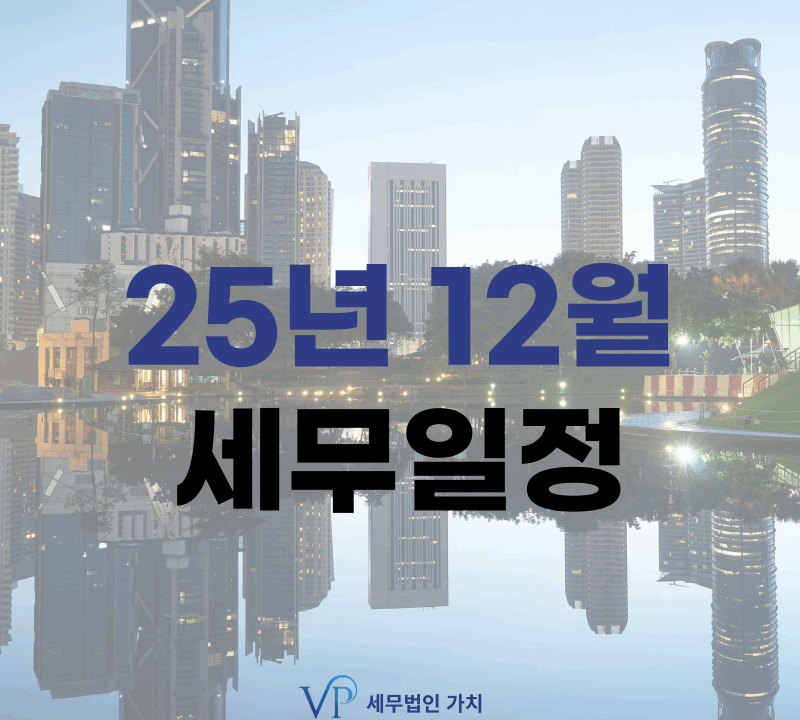 안녕하세요. 대표님의 든든한 절세 파트너 세무법인 가치입니다. 오늘은 2025년 12월 세무 일정을 알려드리려고 합니다. 📣 2025.12.01 (월) 🔹3월말 결산법인 법인세 중간예납 (3월말 결산법인) 🔹소득세 중간예납 납부 및 중간예납추계액 신고 (2025년 1~6월분) 🔹일용근로소득 지급명세서·간이지급명세서[상용근로소득 제외] 제출 (10월분) 🔹개별소비세[농특세·교육세 포함] 신고납부[유류 등] (10월분) 🔹교통·에너지·환경세[교육세 포함] 신고 납부 (10월분) 🔹교육세[금융·보험업자] 중간예납 (3·6·12월말 결산법인 등) ​ 📣2025.12.10 (수) 🔹원천징수분 […]