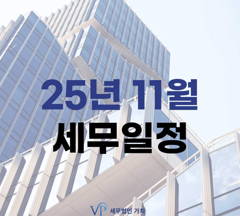 안녕하세요. 대표님의 든든한 절세 파트너 세무법인 가치입니다. 오늘은 2025년 11월 세무 일정을 알려드리려고 합니다. 📣 2025.11.10 (월) 🔹원천징수분 법인세·소득세·지방소득세[소득분] 납부 (10월분) 🔹증권거래세 신고납부[전자등록기관 등 금융투자업자] (10월분) 🔹레저세[농특세·지방교육세 포함] 신고 납부, 주민세[종업원분] 신고납부 (10월분) 🔹국민연금·건강·고용·산재보험료 납부 ​ 📣 2025.11.17 (월) 🔹고용·산재보험 근로내용 확인 신고 ​ 📣 2025.11.20 (목) 🔹담배소비세[지방교육세 포함] 신고납부 (10월분) ​ 📣 2025.11.25 (화) […]